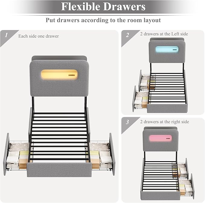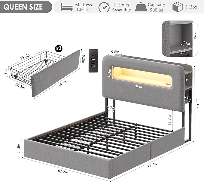 - Special Feature : Storage Headboard, 2 Drawers, Charging Station, LED Lights