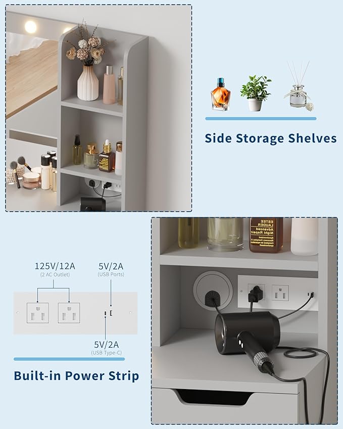 - BUILT-IN CHARGING STATION & POWER OUTLET: Keep hair tools, phones, and beauty devices charged and ready on your vanity desk with mirror and lights. Features convenient plug sockets and USB ports – eliminate messy extension cords & adapters forever!