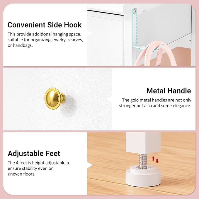 - 【Sturdy Structure Vanity Desk】Crafted from wood and metal, this vanity for teen girl is built to securely support all your makeup essentials. Its X-shaped frame offers additional stability, and the four adjustable feet not only ensure the vanity stays steady on uneven floors but also protect the floor from scratches.