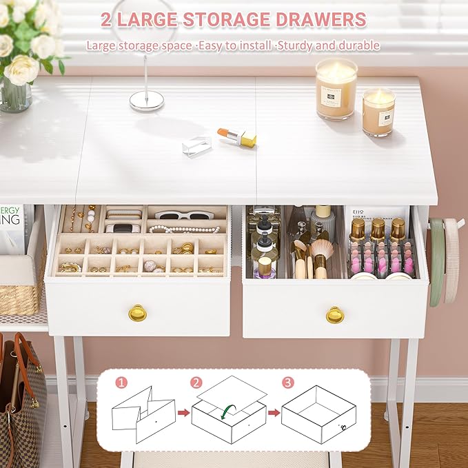 - 【Ample Storage Space】Equipped with 2 smooth-gliding drawers for organizing cosmetics, jewelry, and small essentials, plus a 2-tier open shelf for storing bags, books, or skincare products. A side hook adds convenience for hanging hair dryers, bags, or accessories. This vanity with drawers is perfect as a gift for girls, such as birthdays, Christmas, Girls' Day, and so on.