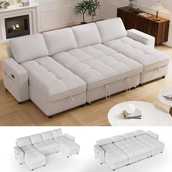 Vipbear Sleeper Sectional Sofa, 105" U Shaped Couch with Pull Out Bed, Convertible Chenille Cloud Sofa with Reclining Backrest | Double Storage Chaise | USB Ports | Tool-Free Assembly | Beige