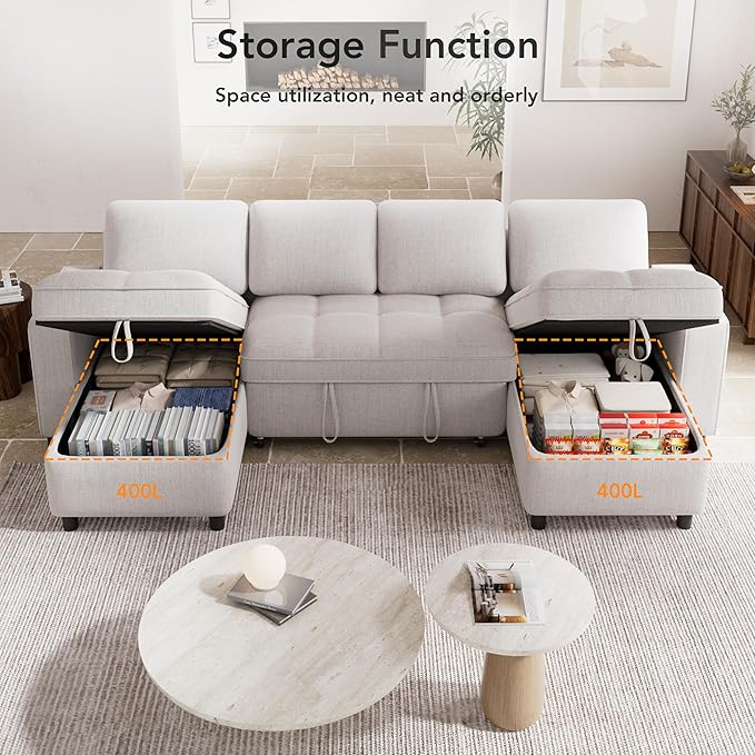 - Two 400 L Spacious Storage Chaise: The pull out couch is designed with two lift-up chaises that opens up to reveal a large storage space of 400L (approximate 400 QT), easily accessible and roomy, perfect for stashing blankets, pillows, or other essentials,combining comfort with a space-saving, clutter-free living.