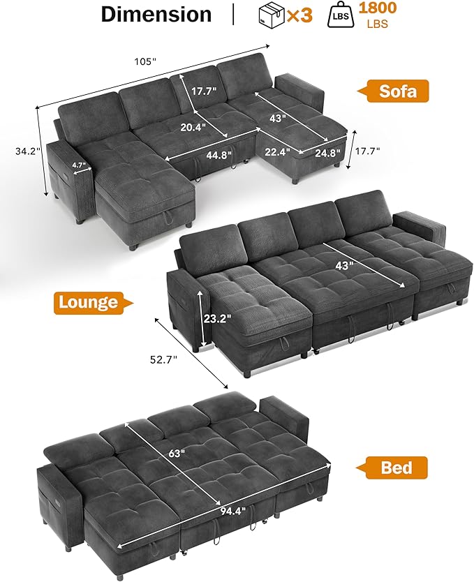 - Tool-Free Assembly: This sectional sleeper sofa bed is easy to assemble with clear instructions and no tools needed. The components snap together effortlessly, allowing you to enjoy your new furniture without the stress of complicated assembly.