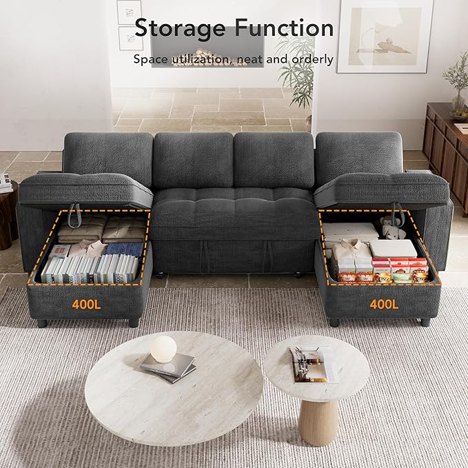 - Two 400 L Spacious Storage Chaise: The pull out couch is designed with two lift-up chaises that opens up to reveal a large storage space of 400L (approximate 400 QT), easily accessible and roomy, perfect for stashing blankets, pillows, or other essentials,combining comfort with a space-saving, clutter-free living.