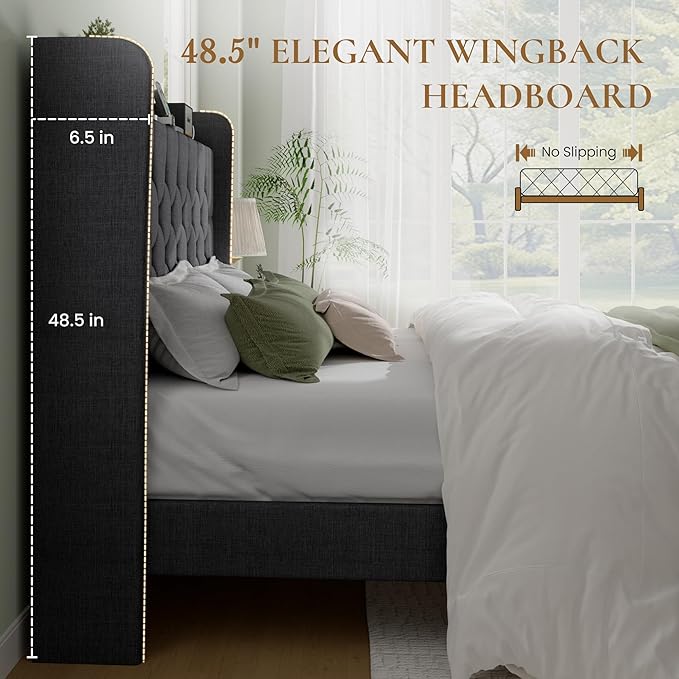 - Linen & Wingback Design: This full bed frame, featuring Linen upholstery and a wingback headboard, combines elegance and support. The recessed edges prevent mattress shifting, ensuring both stability and style