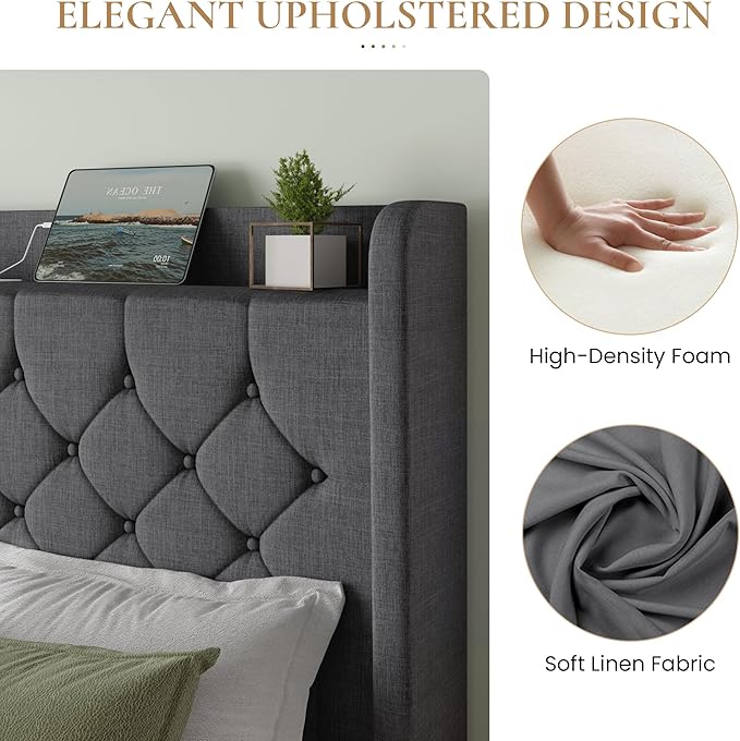 - Multifunctional practical shelf: The full size bed frame with headboard includes a storage shelf for phones, iPads, clocks, and glasses. The headboard is filled with high-density foam, providing a soft and supportive backrest for ultimate relaxation