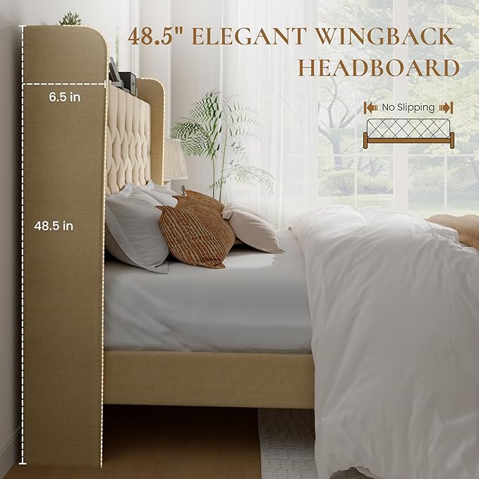 - Linen & Wingback Design: Upholstered in Linen with a wingback headboard, this king size bed frame combines elegance and support. Recessed edges keep the mattress in place, providing stability and a stylish look.