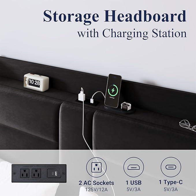 - 【Convenient Charging Station】This bed frame features a practical charging station with 2 AC outlets, 1 USB port, and 1 Type-C port, which meets all your power needs, allowing you to easily charge your electronic devices while in bed