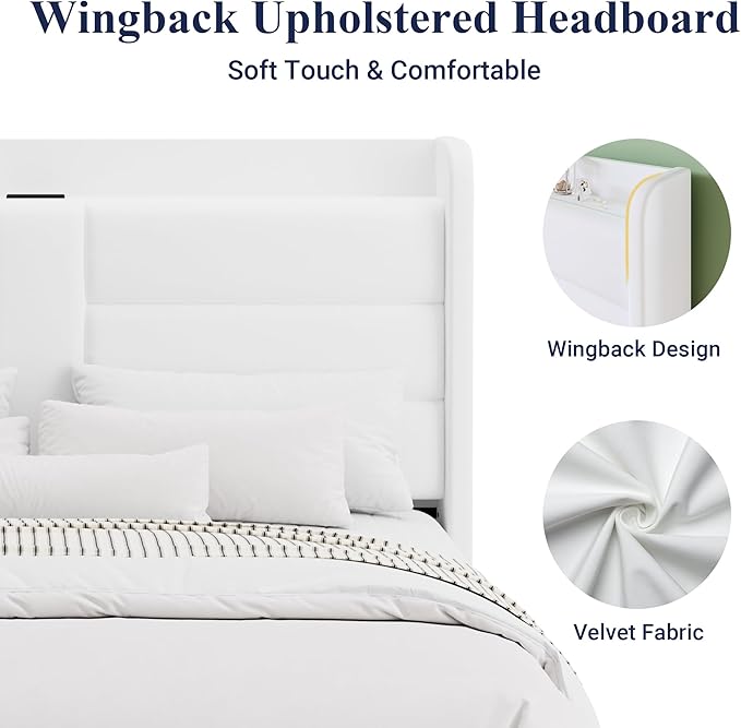 Allewie King Size Platform Bed Frame with Charging Station & Storage Headboard, Upholstered Velvet Wingback Design & USB Port, Strong Wooden Slats Support, No Box Spring Needed, Easy Assembly, White