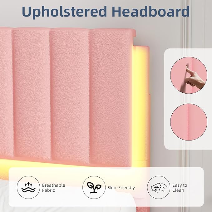 Twin Upholstered Bed Frame with LED Lights, Faux Leather Platform Bed with Headboard and Wooden Slats Support, No Box Spring Needed, Noise-Free, Easy Assembly, Pink