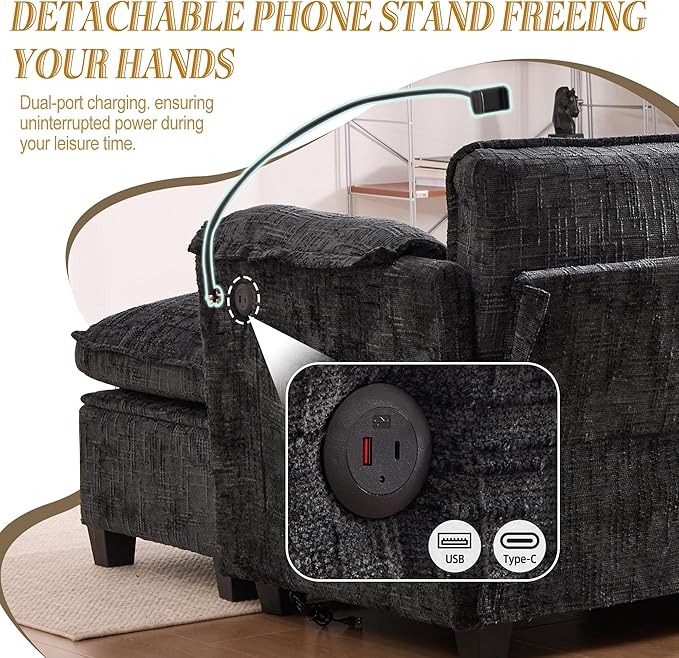 - 【Smart Charging & Phone Holder】 This sofa is designed for modern living with built-in charging features, including one USB port (5V-2.4A), one Type-C port (5V-2.4A), and a convenient phone holder. These thoughtful details allow you to charge devices easily while keeping your phone secure and accessible, offering a seamless blend of comfort, technology, and functionality in one versatile seating solution.