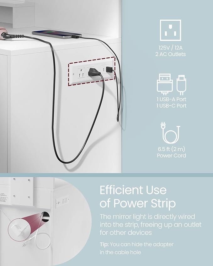 - Built-In Charging Station: Equipped with a built-in power strip featuring 2 AC outlets, a USB-A port, and a USB-C port, this makeup vanity powers your styling tools and charges your devices with ease