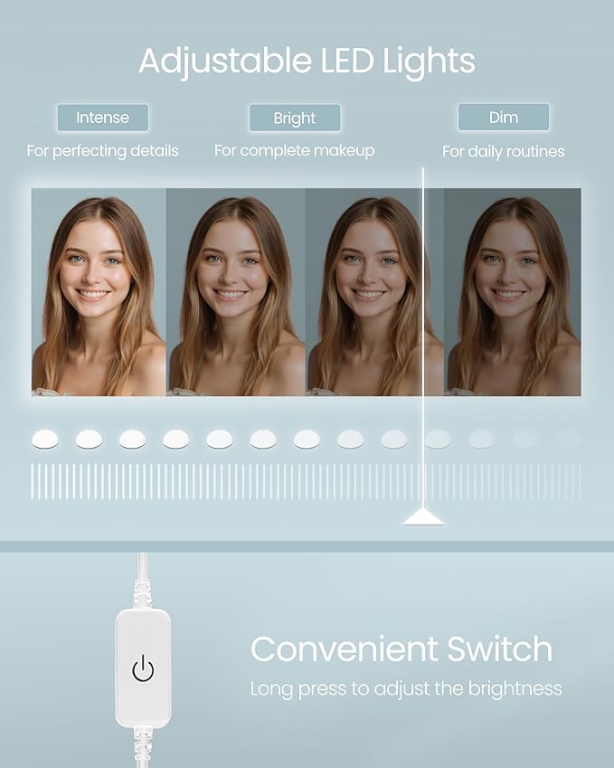 - Lighted Mirror: The vanity mirror is surrounded by 9 adjustable bulbs, allowing you to set the perfect brightness for flawless makeup application every time