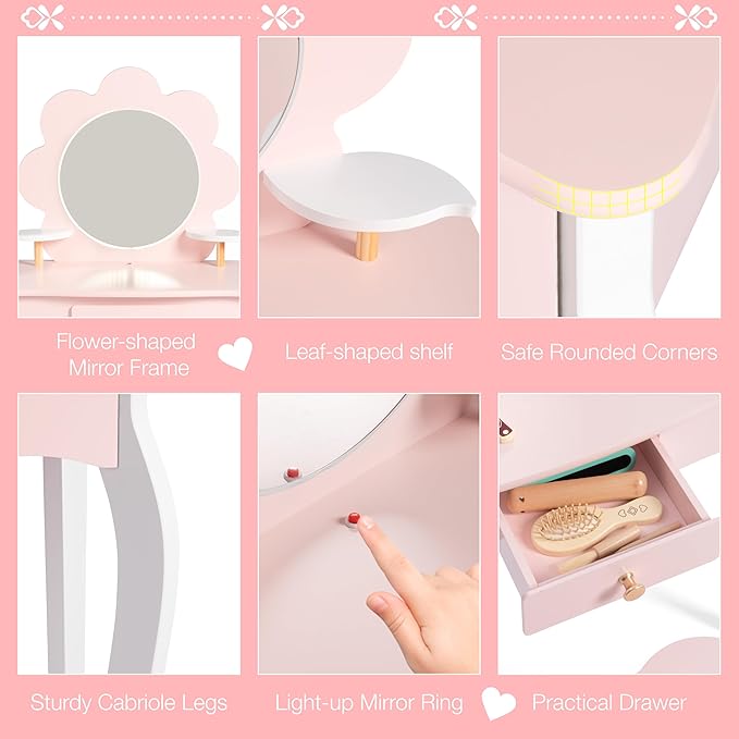 - 【ADORABLE FLOWER-SHAPED DESIGN】This lovely floral vanity table and chair set comes in a sweet pink-and-white color mix that’s soft and eye-catching. It has a cute flower-shaped mirror and playful leaf-shaped shelves that make getting ready extra fun. Your little princess is sure to fall in love with it!
