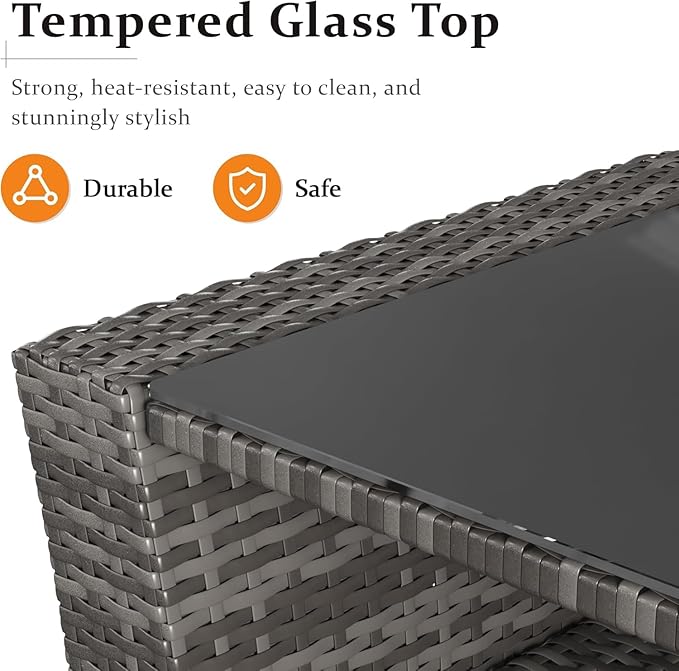 • 【Enduring Material】Incorporating a rust-resistant powder-coated steel frame for steadfast support and weather-resistant PE rattan wrapping for enduring elegance, our patio furniture set is crafted to withstand varying weather conditions.