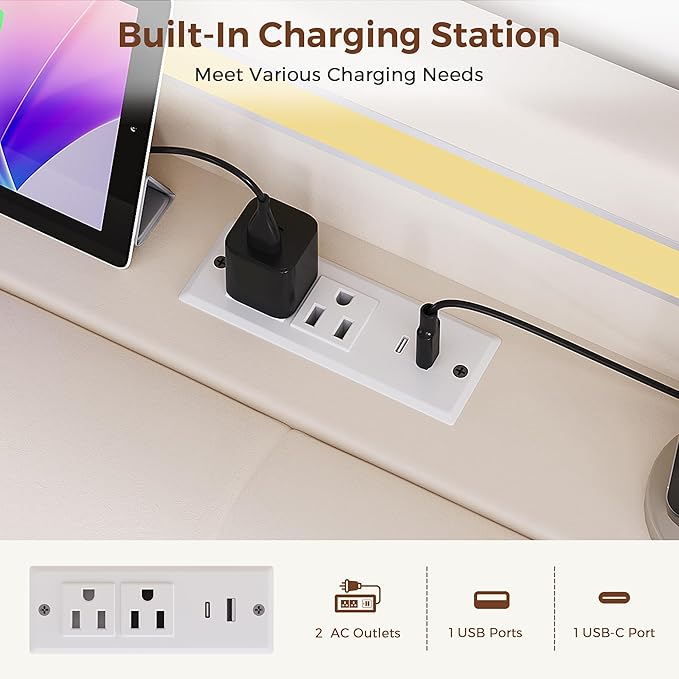 - ALL-IN-ONE INTEGRATED CHARGING STATION: The built-in charging hub features 2 AC outlets, 2 USB ports, and 1USB-C port. It powers everything from your phone and laptop to lamps and tablets. Keep all your devices powered up and within reach, eliminating messy cable clutter and the need for ugly extension cords