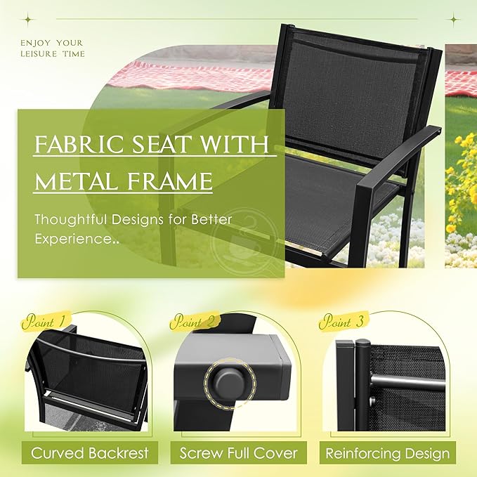 - [ Breathable & Cool Comfort ] The seat and backrest are made of selected Textilene mesh fabric, designed specifically for outdoor furniture. The porous material keeps you cool and comfortable even on hot summer days. Easy to clean—just wipe with a dry or damp cloth