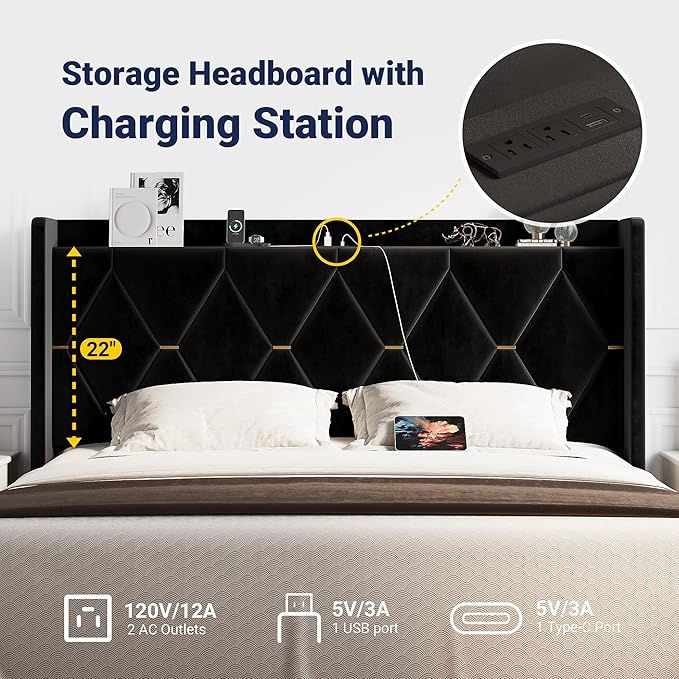 Allewie Velvet King Size Upholstered Bed Frame with Wingback Storage Headboard & Charging Station, Platform Bed with Diamond Tufted Design & Gold Trim, No Box Spring Needed, Easy Assembly, Black