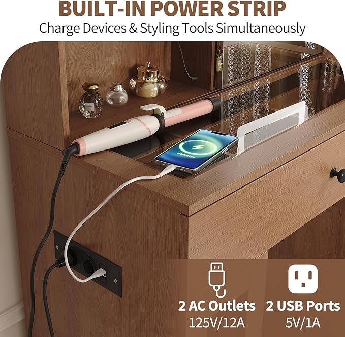 - Power-Enabled Beauty Hub: Streamline your entire routine at this Vanity Desk with Mirror and Lights, Glass Top, featuring built-in AC/USB outlets to power styling tools and devices right at your station. The spacious Glass Top on this Vanity Desk with Mirror and Lights provides ample room for gadgets while you utilize the illuminated mirror for precision grooming.