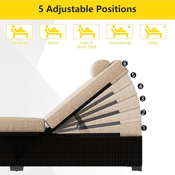 - Slow-paced: Lounge out in the sun, getting your tan back on with this Sunbathing chaise lounge. Provides maximum comfort with 6 adjustable back positions, which will fit your different needs of reading, relaxing, and sleeping, serving as a bed, lounge or sofa.
