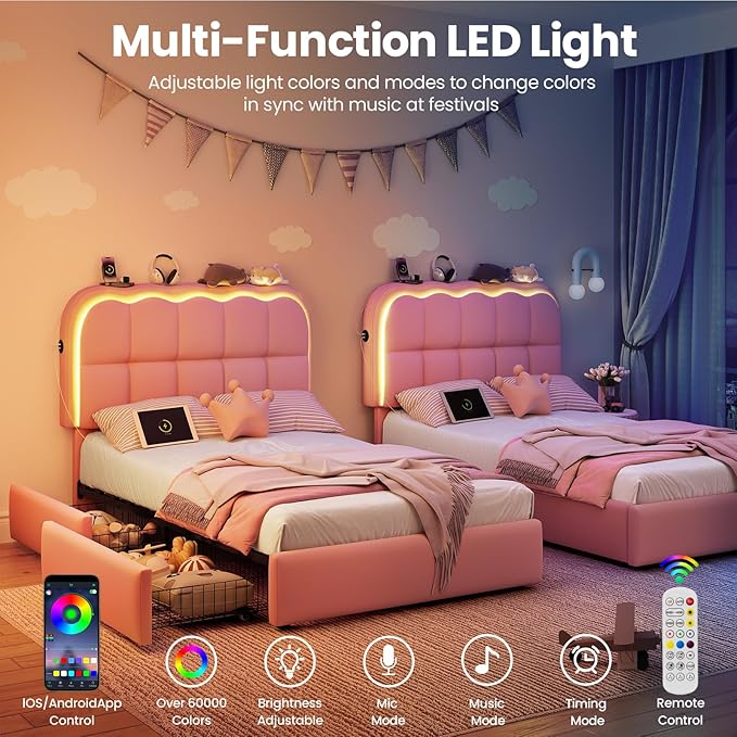Twin Bed Frame with Storage Drawers and Headborad, Upholstered LED Twin Size Platform Bed Frame for Kids – Sturdy Metal Bed Frame Twin with Wood Slats Support, No Box Spring Needed, Pink