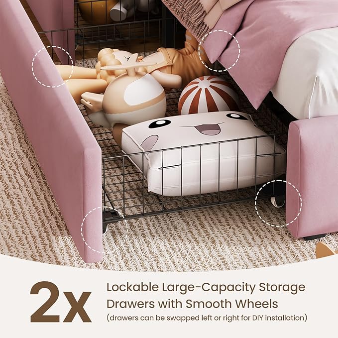 - 【2 Large-Capacity Drawers】This pink double Twin bed frame with storage features two oversized drawers with silent glides, maximizing storage space for seasonal clothing, spare bedding, and other household items. The locking mechanism ensures drawers stay securely in place.