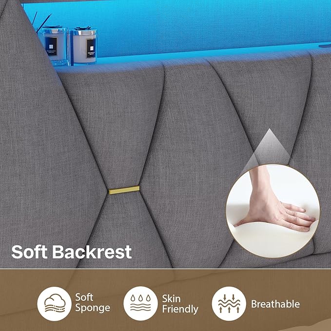 - 【Smart RGB LED Lights】King size bed frame and headboard have multifunctional LED lights strips,bed frame king have over 60000 colors to choose from, Mobile App +Remote Control multiple control modes. King bed frame with storage can freely set the brightness, color, mode and timing functions to create various scenes