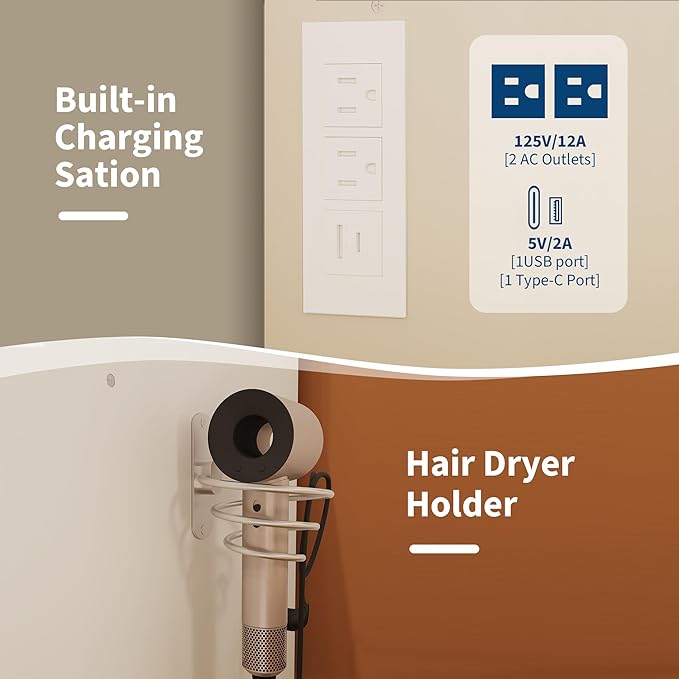 - 【 Multi-functional Design 】 This dressing table is equipped with a convenient charging station, featuring two standard sockets and two USB ports. The dressing table with a hair dryer Holder allows you to easily place the hair dryer. It can be easily connected to a hair dryer or curling iron at the same time, and charge your mobile phone or tablet when you are ready.
