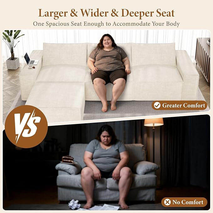- Spacious & Comfortable: The 114 inch modular sofa features 31.5 inch width and 29.5 inch deep seats, providing ample seating space to lounge for you and your family, especially perfert for heavy people. 9.8 inch wide armrests is an ideal place for placing drinks or laptop. The setional couch can easily transforms any room into a warm and comfortable haven for relaxing, entertaining guests, or enjoying a family movie night