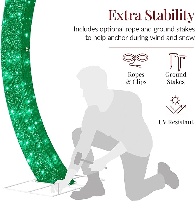 - WEATHER-FRIENDLY DESIGN: Shimmering durable fabric sits on a powder-coated wire frame to withstand the elements for many holiday season, with optional rope and ground stakes are included for added support in windy weather; OVERALL DIMENSIONS: 114" (L) x 24" (W) x 120" (H)