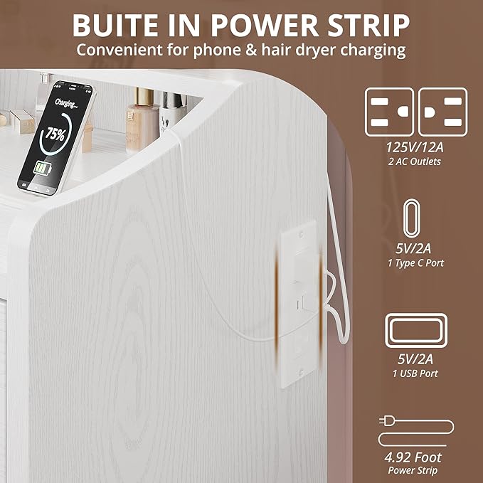 - Built-in Charging Station: This makeup vanity desk with lights is equipped with power outlets with a USB port, a Type C port, and 2 AC ports, convenient for charging hair dryers, mobile phones, and other devices