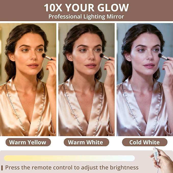 - Vanity Desk with Mirror and Lights: This vanitys is equipped with 12 LED bulbs, providing 3 different light modes: warm yellow, natural light, and bright white. The brightness is adjustable, which can match your different makeup needs