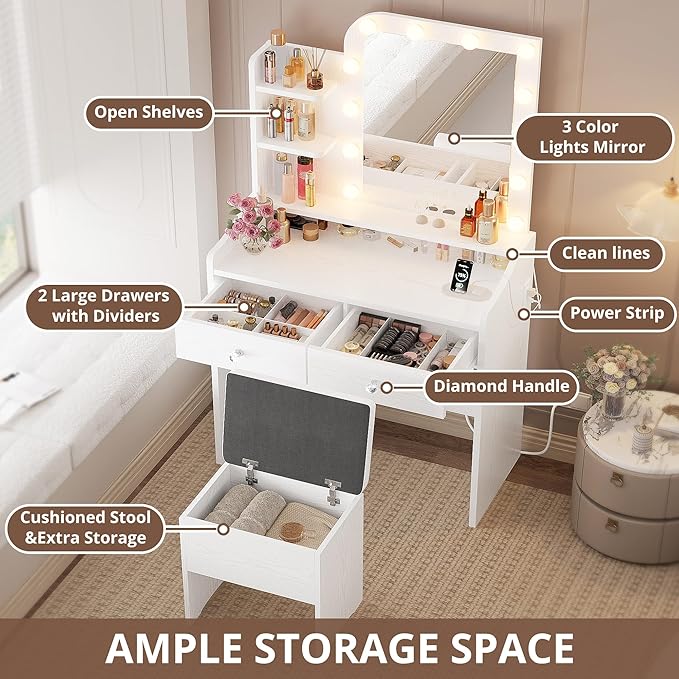 LIKIMIO Vanity Desk with Mirror and Lights, Makeup Vanity Table Set with Storage Stool, Makeup Drawer Organizer, 3 Color Modes Adjustable Bulb, Power Outlet, White Vanity for Bedroom