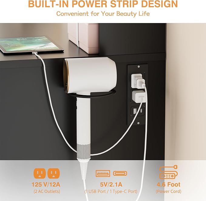 - Power Outlet & Hair Dryer Holder: The dresser comes with a convenient charging station as well as a hair dryer holder. There are 2 outlets on the side of the dresser, 1 USB port and 1 Type-C port. You can blow dry your hair in front of the vanity while easily charging your cell phone or other electronic devices.