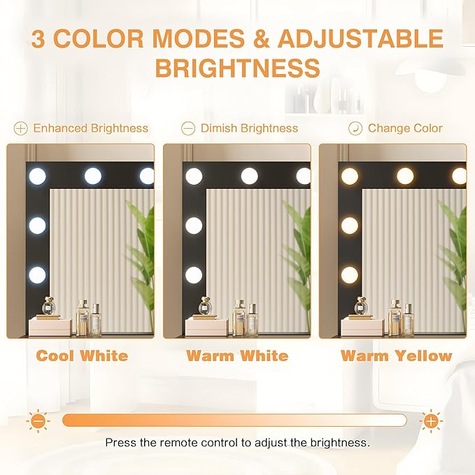 - LARGE MIRROR & 10 HOLLYWOOD STYLE LIGHT BULBS: Clean large mirror can show more of your beauty. With 10 LED bulbs with adjustable brightness and color, it perfectly adapts to all kinds of ambient light, creating the most comfortable environment for you to apply makeup easily.