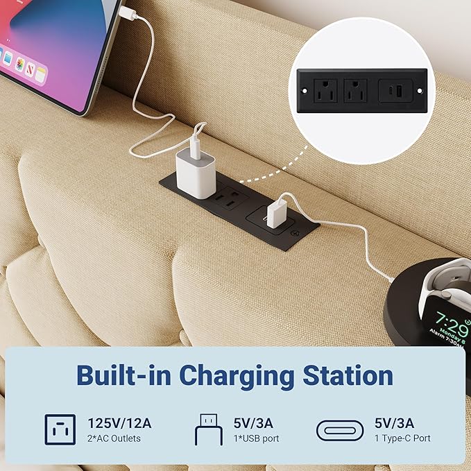 - Power Charging Station: Full size platform bed with headboard featuring an upgraded Power Charging Station—2 outlets, 1 USB, 1 Type-C port. Charge phones, iPads, lamps, and more without leaving your bed