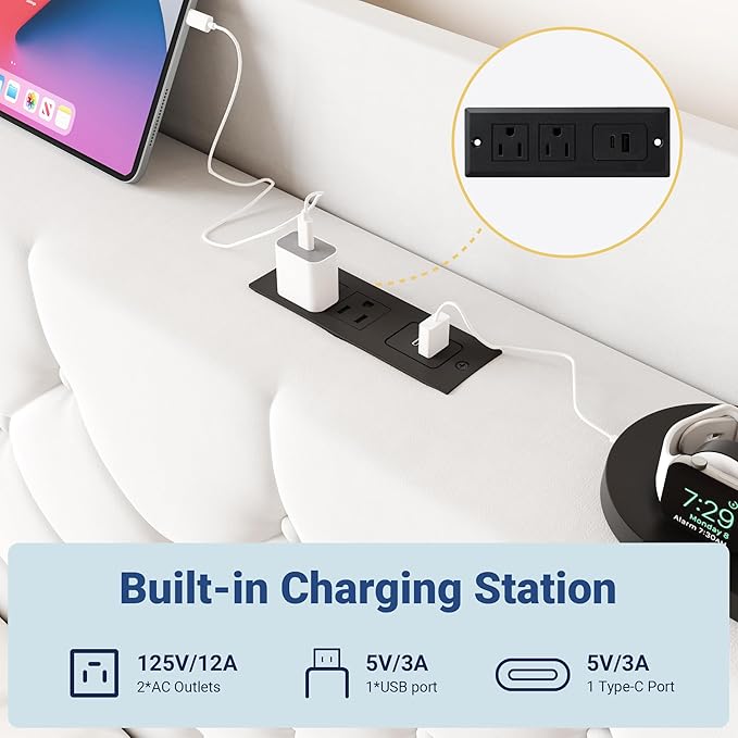 - Power Charging Station: Queen size platform bed with headboard featuring an upgraded Power Charging Station—2 outlets, 1 USB, 1 Type-C port. Charge phones, iPads, lamps, and more without leaving your bed