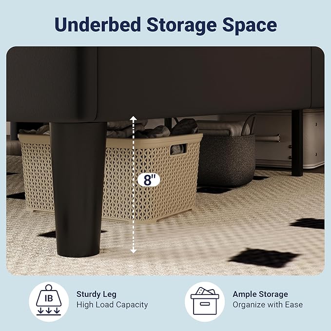 - Under-Bed Storage Space:The bed frame king size offers 8" under-bed space for storage boxes and other essentials. Easy access for vacuum cleaners or robot sweepers keeps your bedroom tidy and organized