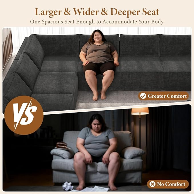 - Flexible Modular Design: The Oversized sectional sofa has 6 separate sections. Each module can be easily moved and reassembled into loveseat, L shaped or U shaped sofa, chaise lounge, sleeper sofa, or oversized family sectional couch to match your lifestyle. The modular design allows you to freely create your ideal layout and adapt to ever-changing spaces. All modular seats have a anti-slip design on the bottom to prevent the sofa from sliding during daily use