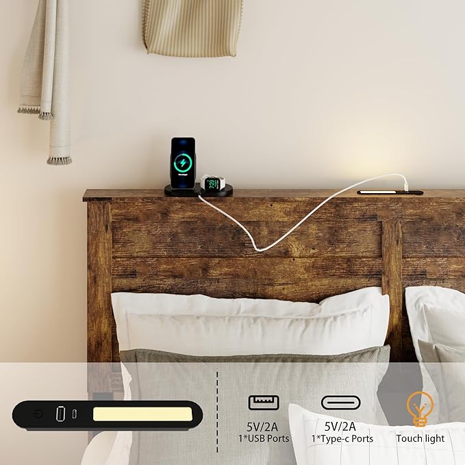 - Bed Frame with Charging Station: The bed frame has 2 standard plug sockets and 1 USB port, 1 Type-C port on the storage headboard, and it comes with a 7.9-foot long power cord. It makes it very convenient for you to charge your mobile phone and tablet, or use a book light to read in bed.