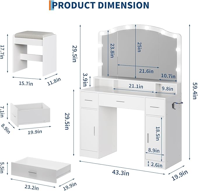 • Ample Storage Space: This vanity set features three spacious drawers, two cabinets with adjustable shelves, and a long storage shelf, keeping your makeup, hair accessories, and tools organized and easily accessible for a seamless beauty routine