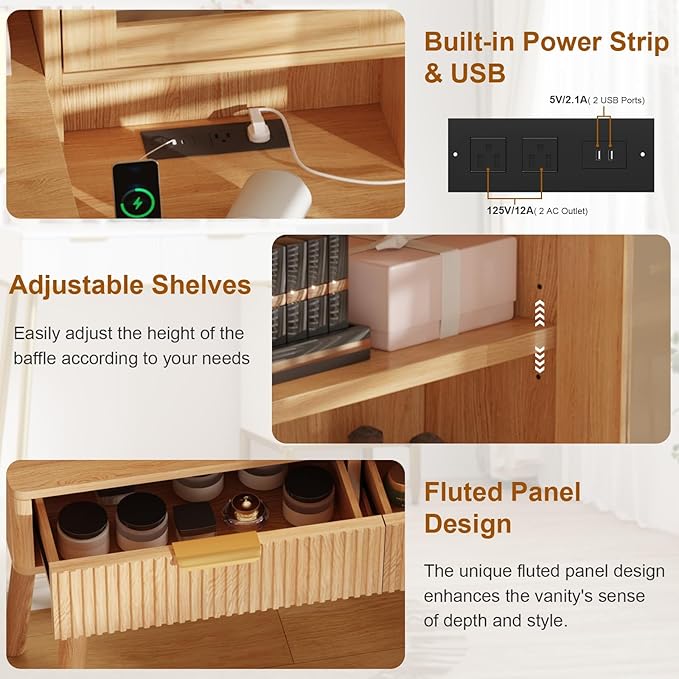 - Built-In Power Outlet: Stay connected and powered up with two standard sockets and two USB ports, ideal for charging hair tools, beauty devices, and mobile phones while you get ready.