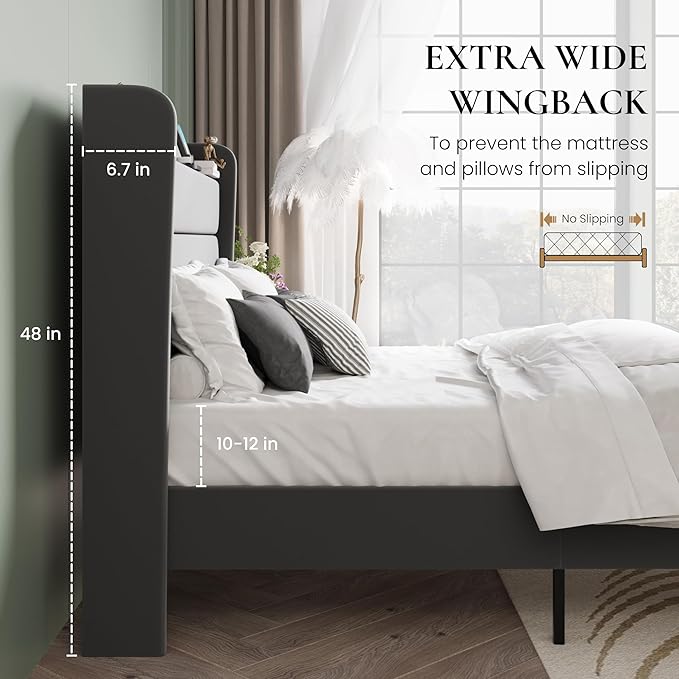 - Extra-Wide Wingback Design: The bed frame queen size features an extra-wide winged back, preventing the the mattress and pillows from slipping, offering both style and functionality