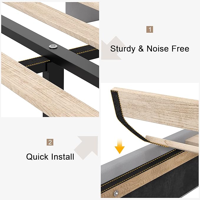 - Stable & Firm Structure - 12 wooden slats and 9 legs combo with center steel frame support, this queen size bed frame features up to 1200 lb max weight capacity. Works great with most kinds and height mattresses. No box spring needed.