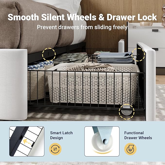 - 【Ample Storage Space】 This king size bed base features 4 large drawers with smooth wheels, offering convenient storage for clothing and personal items. Say goodbye to clutter and maximize your bedroom’s organization and functionality