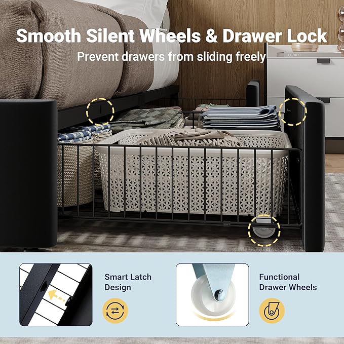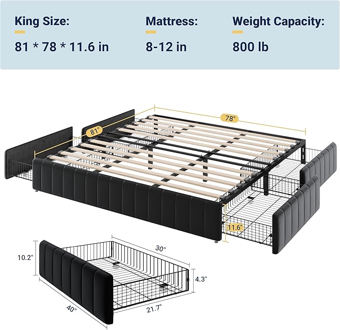 - 【Ample Storage Space】 This king size bed base features 4 large drawers with smooth wheels, offering convenient storage for clothing and personal items. Say goodbye to clutter and maximize your bedroom’s organization and functionality
