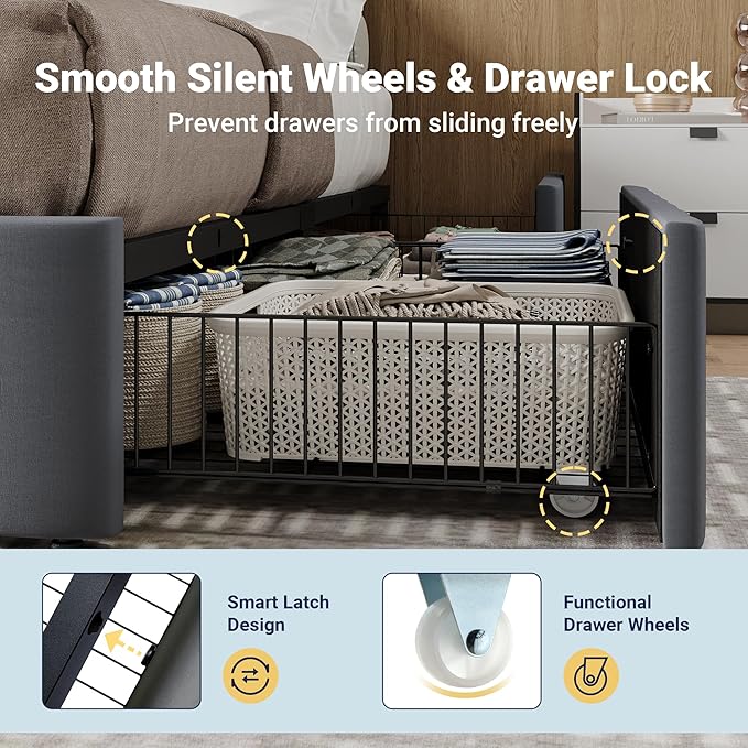 - 【Ample Storage Space】 This king size bed base features 4 large drawers with smooth wheels, offering convenient storage for clothing and personal items. Say goodbye to clutter and maximize your bedroom’s organization and functionality