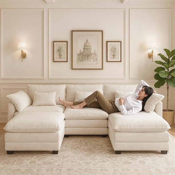 COMHOMA 120" U Shaped Sectional Sofa with Movable 2 Ottomans,Comfy Cloud Modular Couch with Throw Pillows,Modern Chenille Deep Seat Sofa Couches for Living Room,Beige