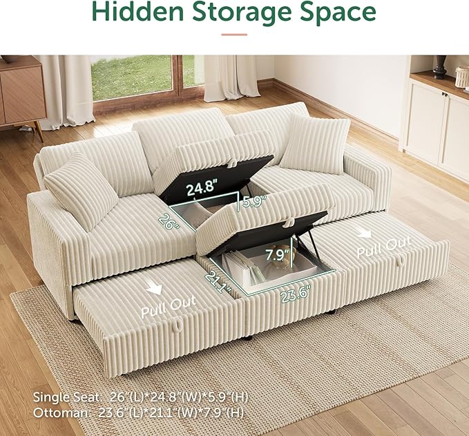 - Convertible Design: Extend pull-out left/right seats and ottoman to switch 3-seater sofa into U-shape, L-shape, or sleeper bed effortlessly, ideal for gatherings or overnight guests