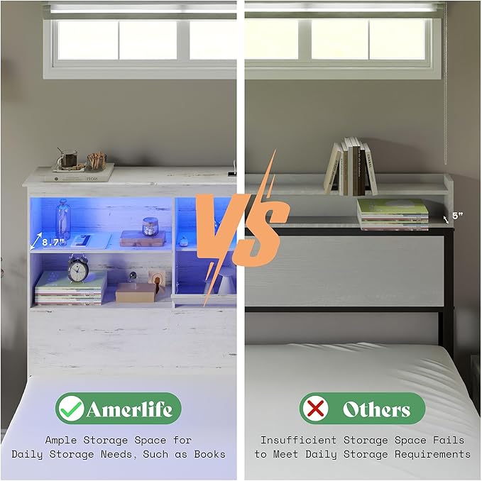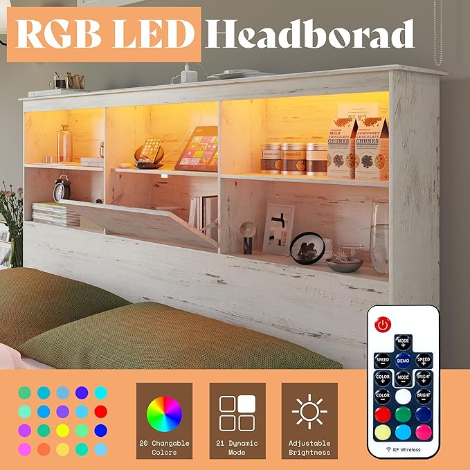 • Charging Station & RGB LED Lights – Built-in 2 AC outlets + 2 USB ports (ETL/UL certified) plus RGB LED headboard lighting with 20 colors, 21 modes, and remote control create the perfect farmhouse bedroom ambiance.